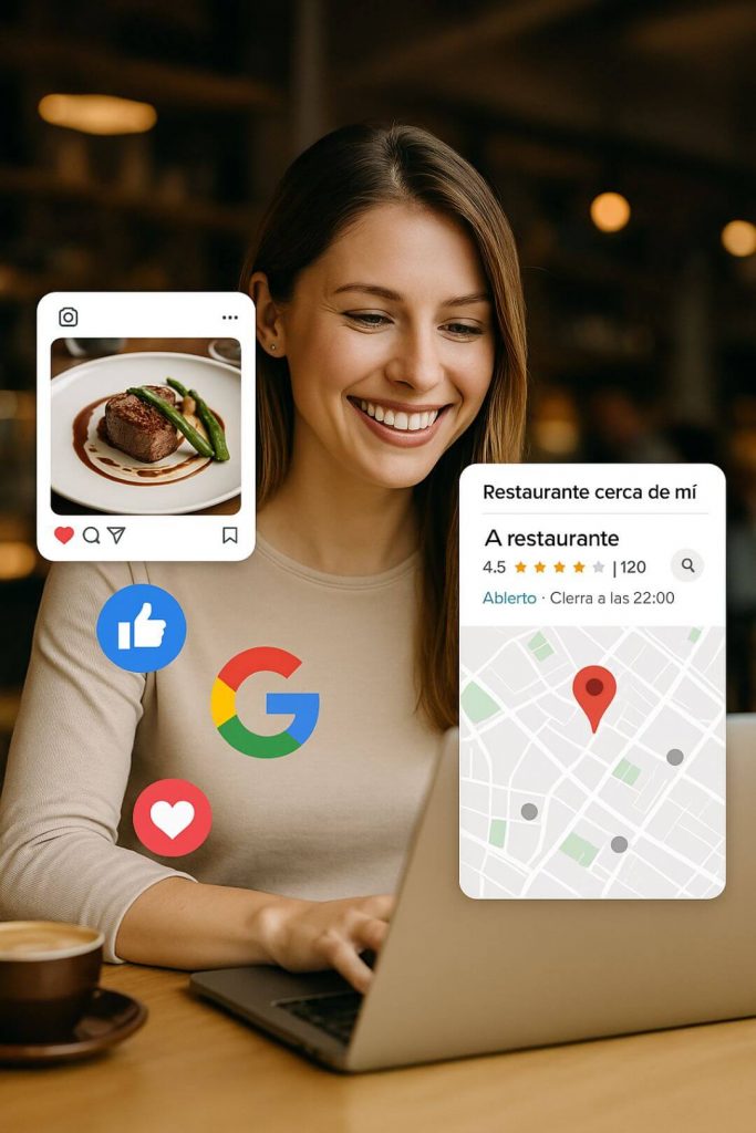 Te ayudamos a que tu restaurante aparezca primero en Google y redes sociales, cuando te busquen en tu zona, hacemos que tu reputación sea la mejor ante tus clientes.